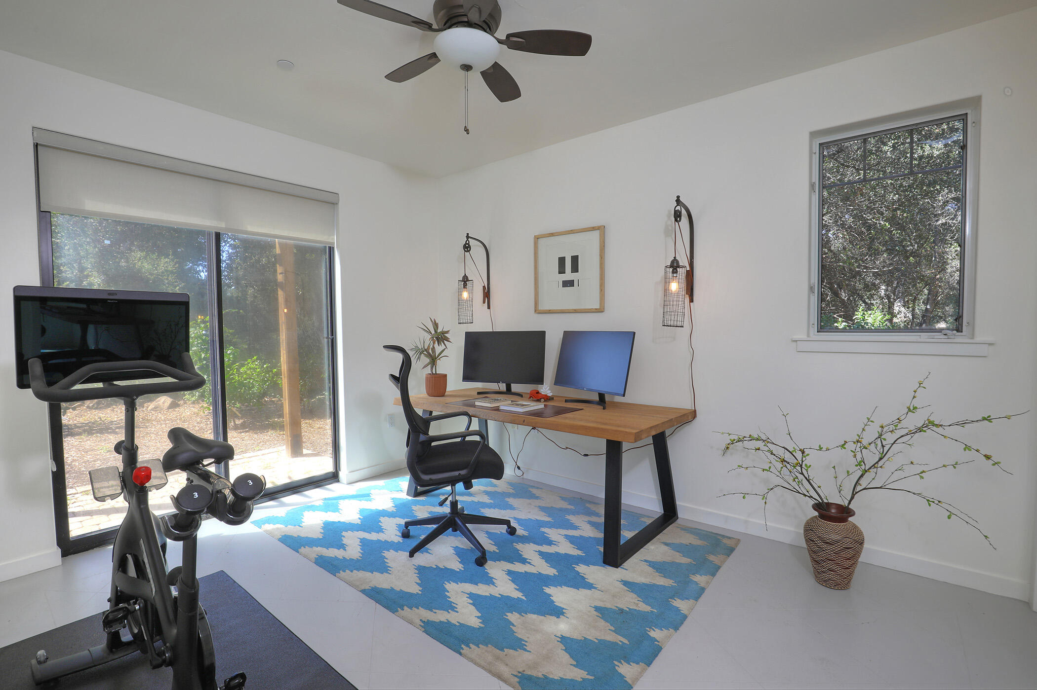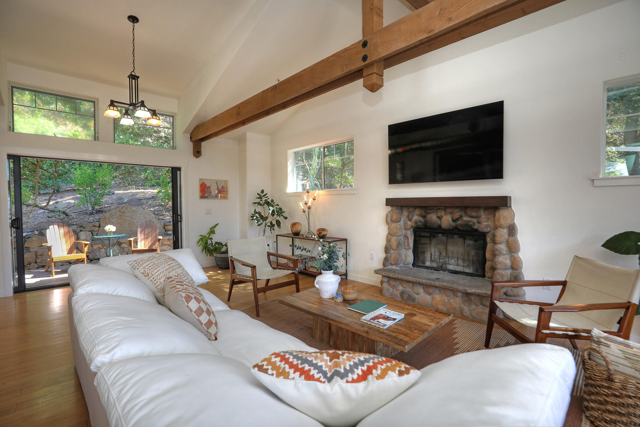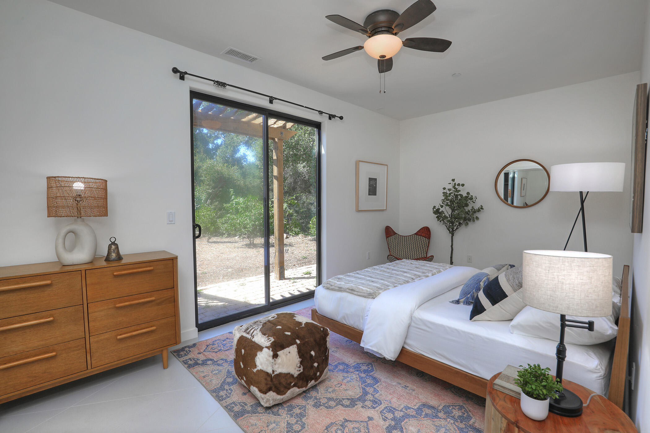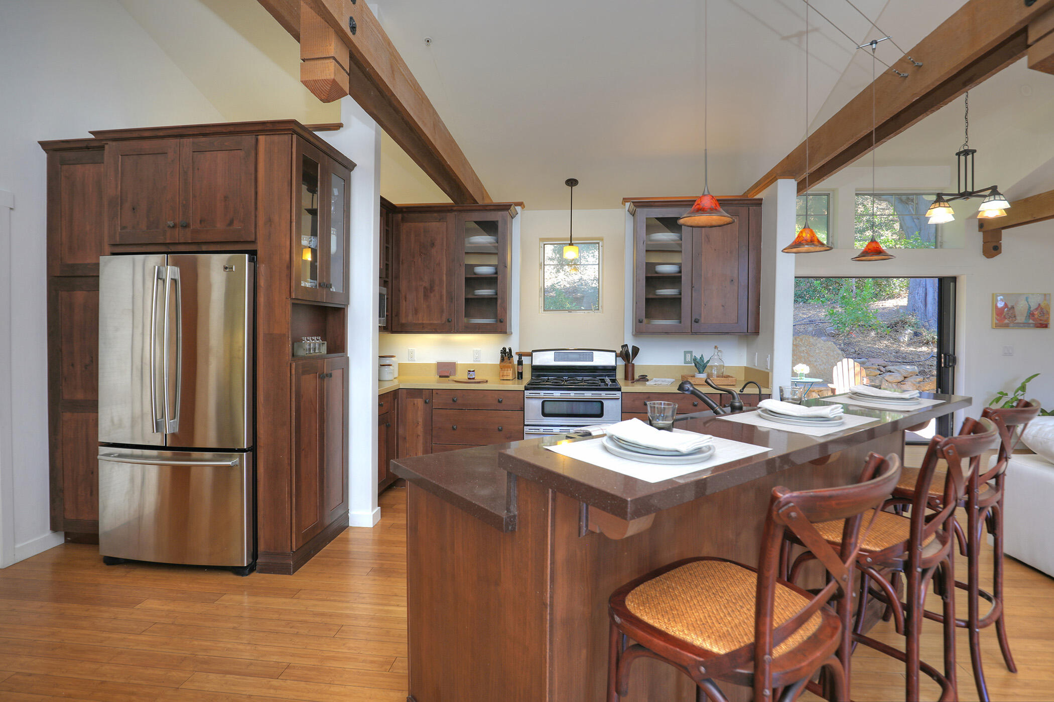 Additional highlights include a whole-house water filtration system, superior insulation, fire rated and insect resistant siding, energy efficient appliances, tankless water heater, bamboo and concrete flooring, drought tolerant landscaping, permeable driveway, rock terraces, bioswales, and a rain harvesting system with 1,000 gallon tank and UV filtration for onsite fruit trees.