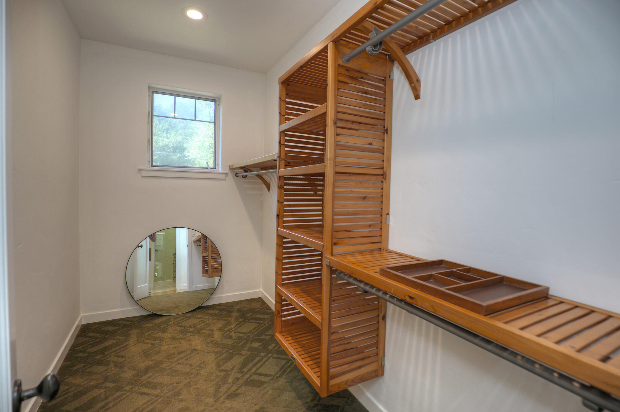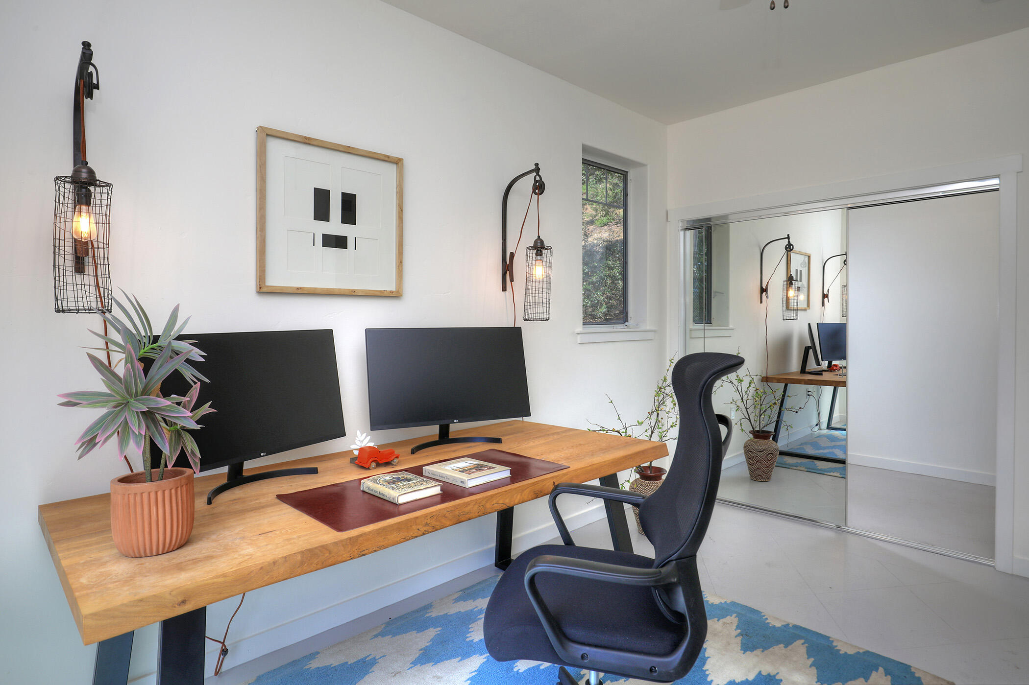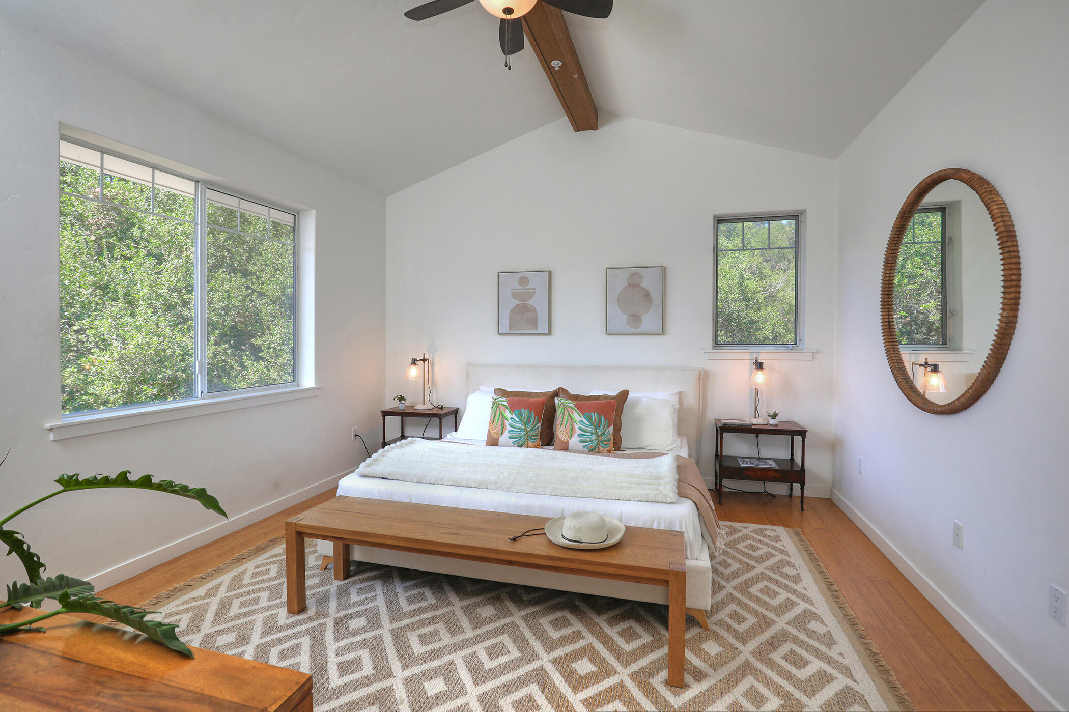 Additional highlights include a whole-house water filtration system, superior insulation, fire rated and insect resistant siding, energy efficient appliances, tankless water heater, bamboo and concrete flooring, drought tolerant landscaping, permeable driveway, rock terraces, bioswales, and a rain harvesting system with 1,000 gallon tank and UV filtration for onsite fruit trees.