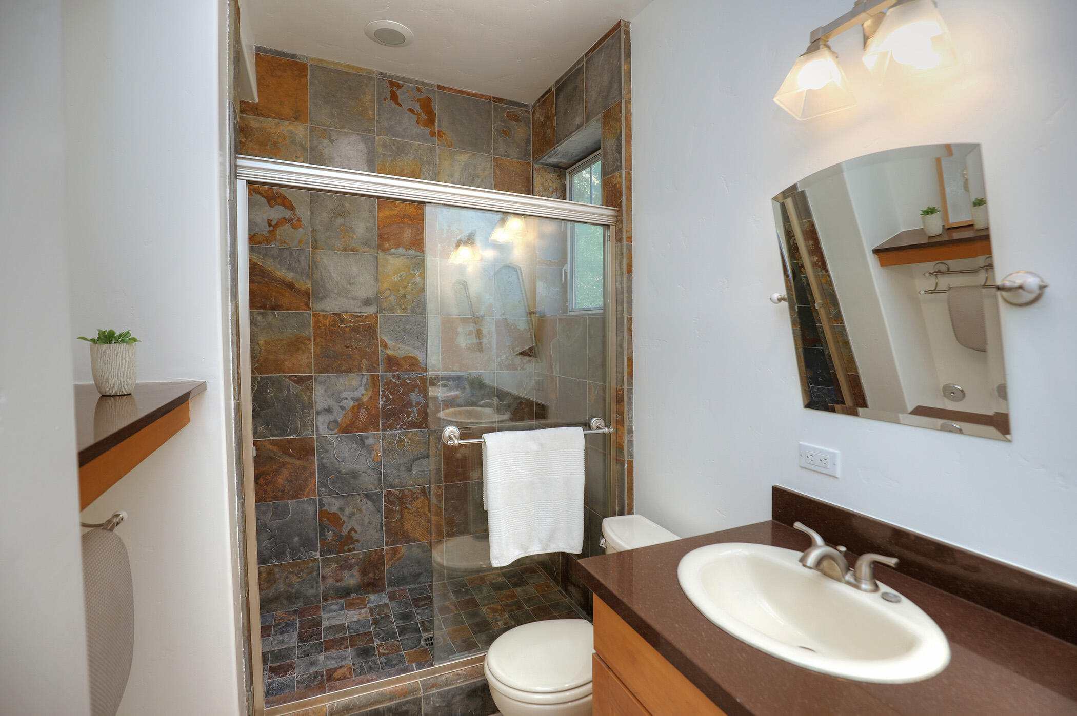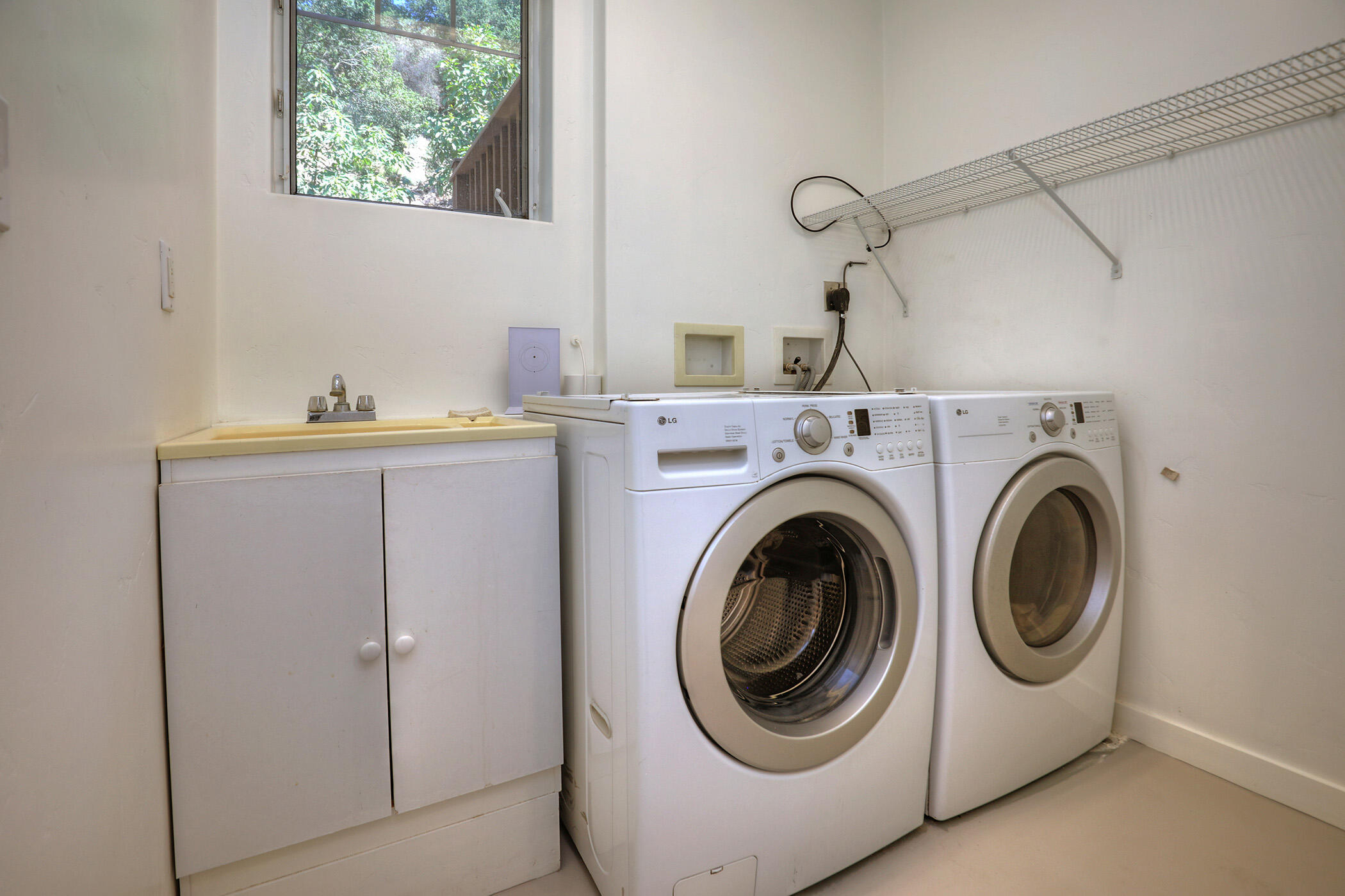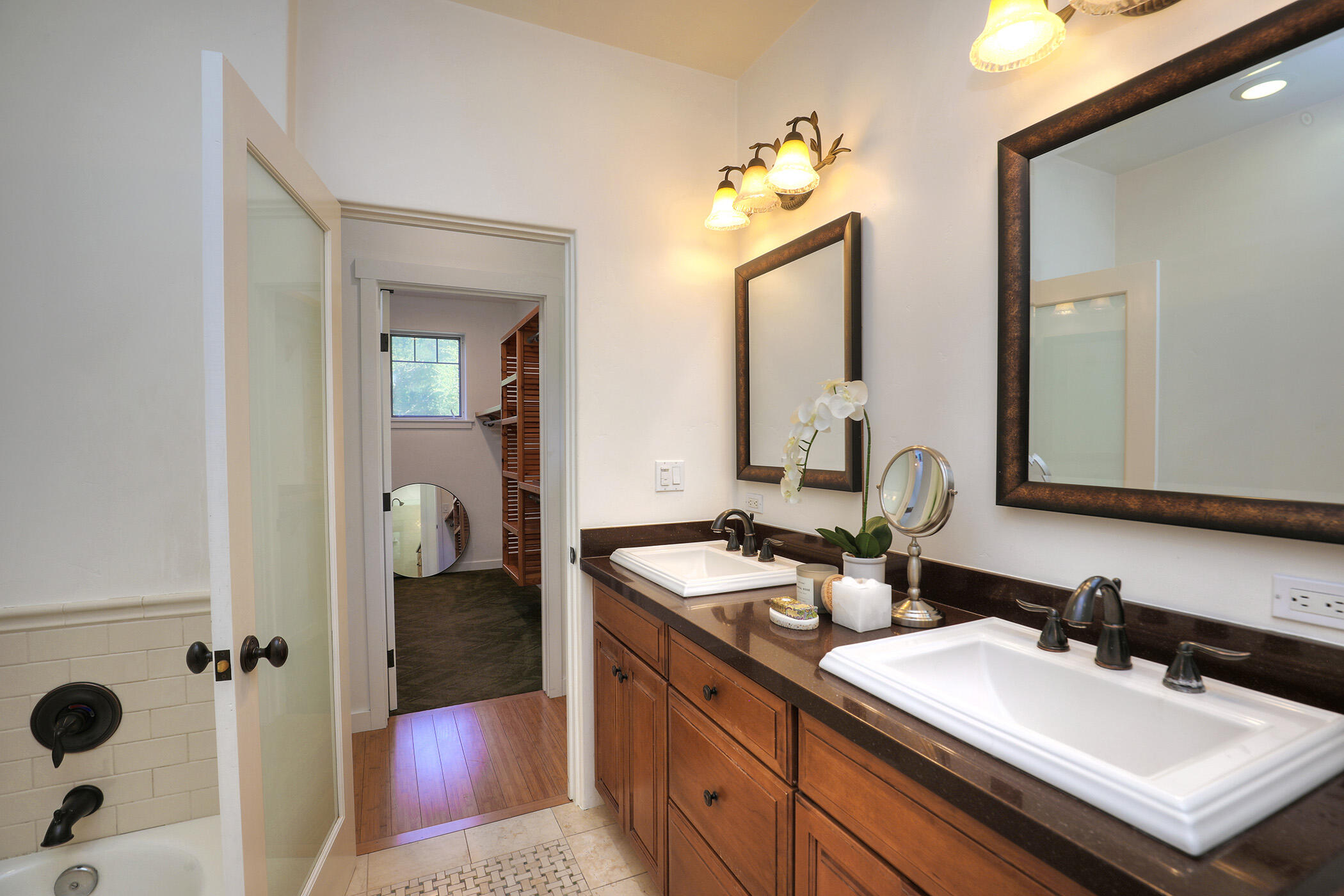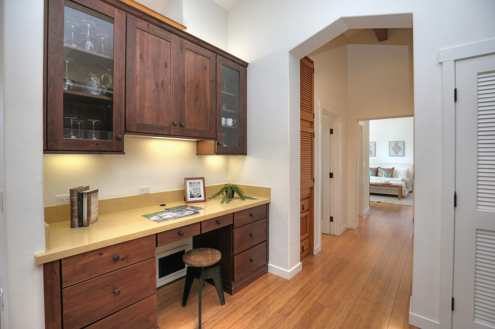 Additional highlights include a whole-house water filtration system, superior insulation, fire rated and insect resistant siding, energy efficient appliances, tankless water heater, bamboo and concrete flooring, drought tolerant landscaping, permeable driveway, rock terraces, bioswales, and a rain harvesting system with 1,000 gallon tank and UV filtration for onsite fruit trees.