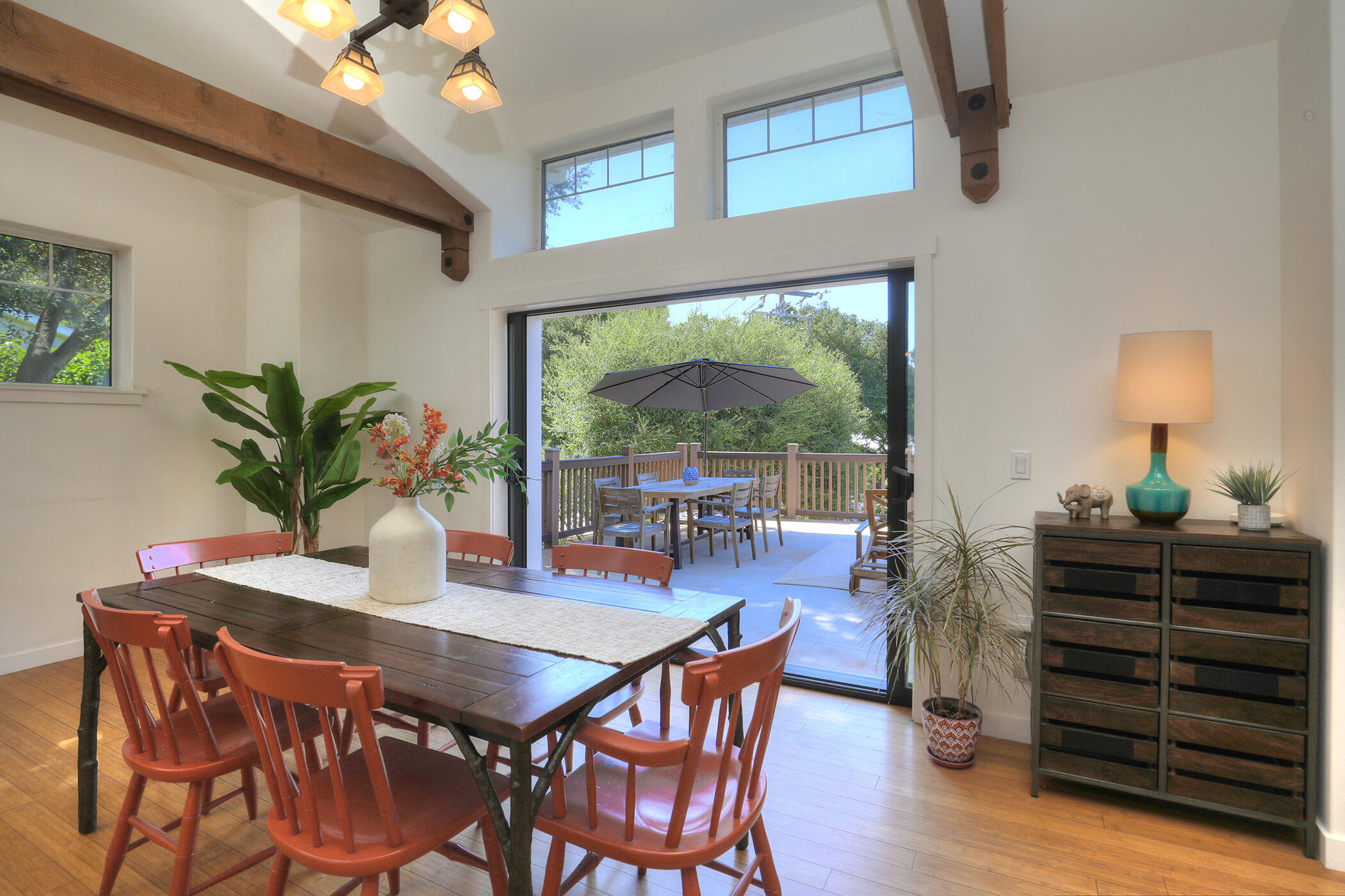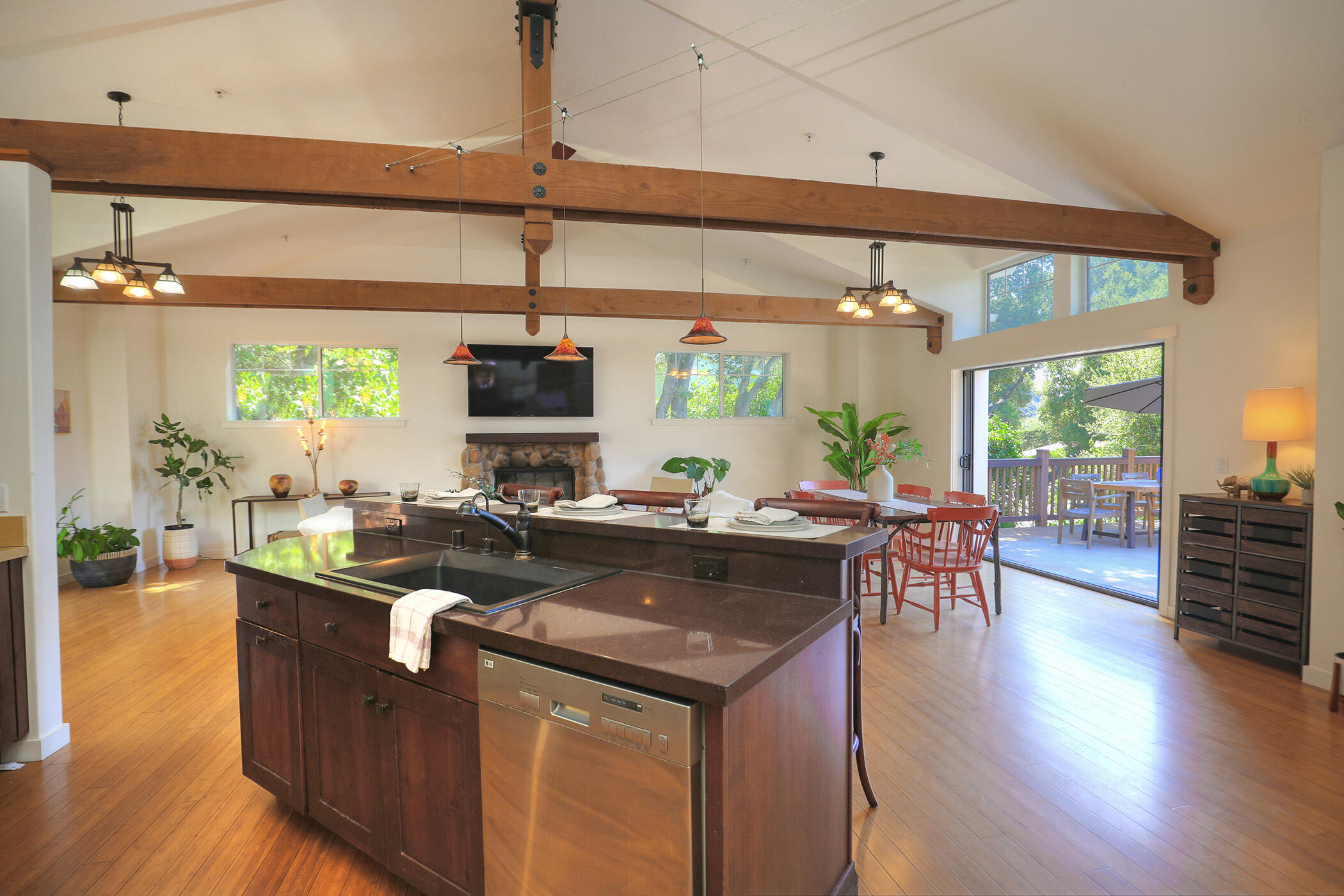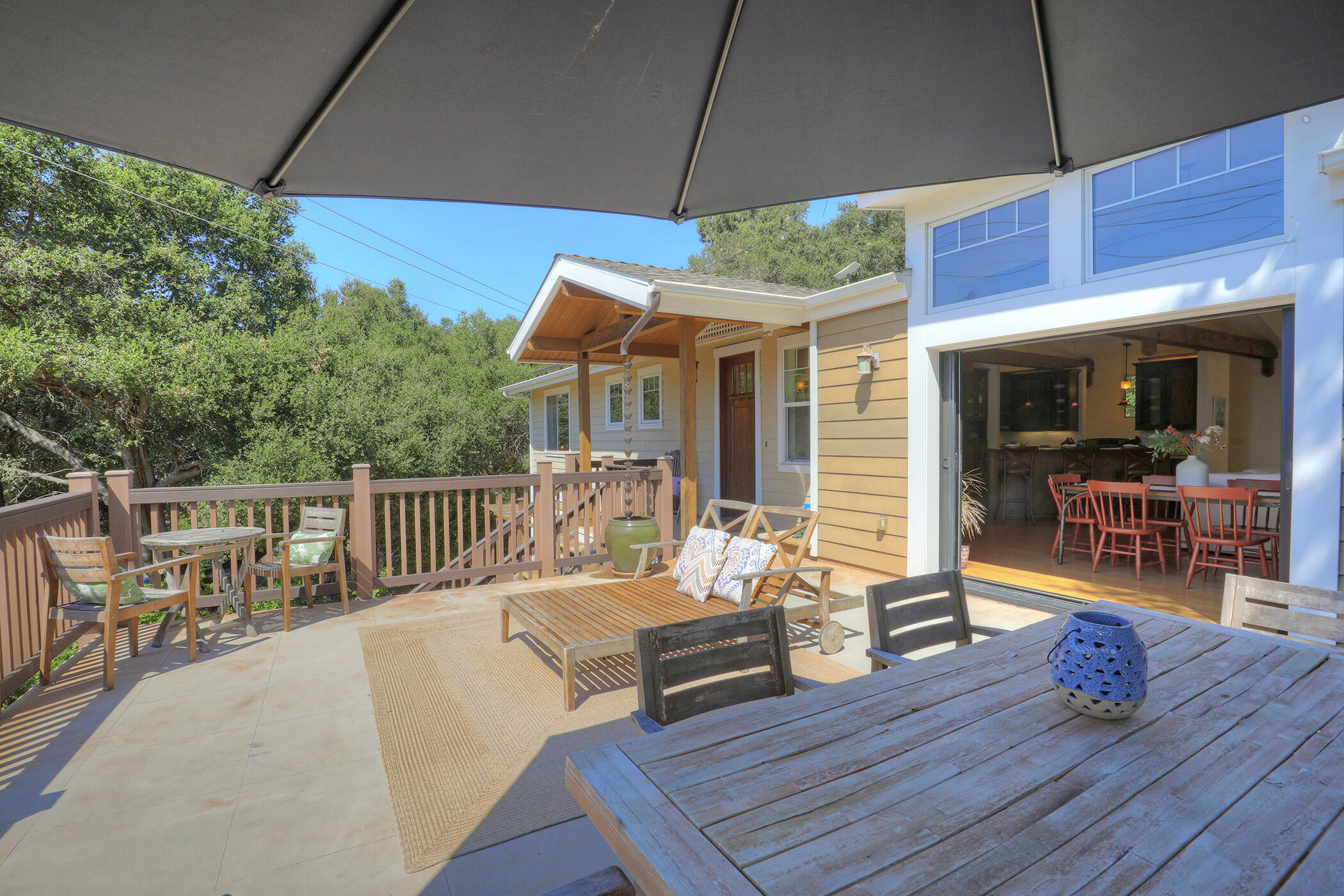 The solar powered residence offers 2,400 sq. ft. of living space with 3 bedrooms, 2.5 bathrooms, an office, laundry room, oversized two car garage, and a spacious rec room (not included in sq. ft.). The dramatic great room features 13' cathedral ceilings, a gourmet kitchen, and a river rock fireplace. Sliding glass doors open to a shaded BBQ patio on one side and a generous south facing, ocean view deck on the other perfect for entertaining and seamless indoor outdoor living.