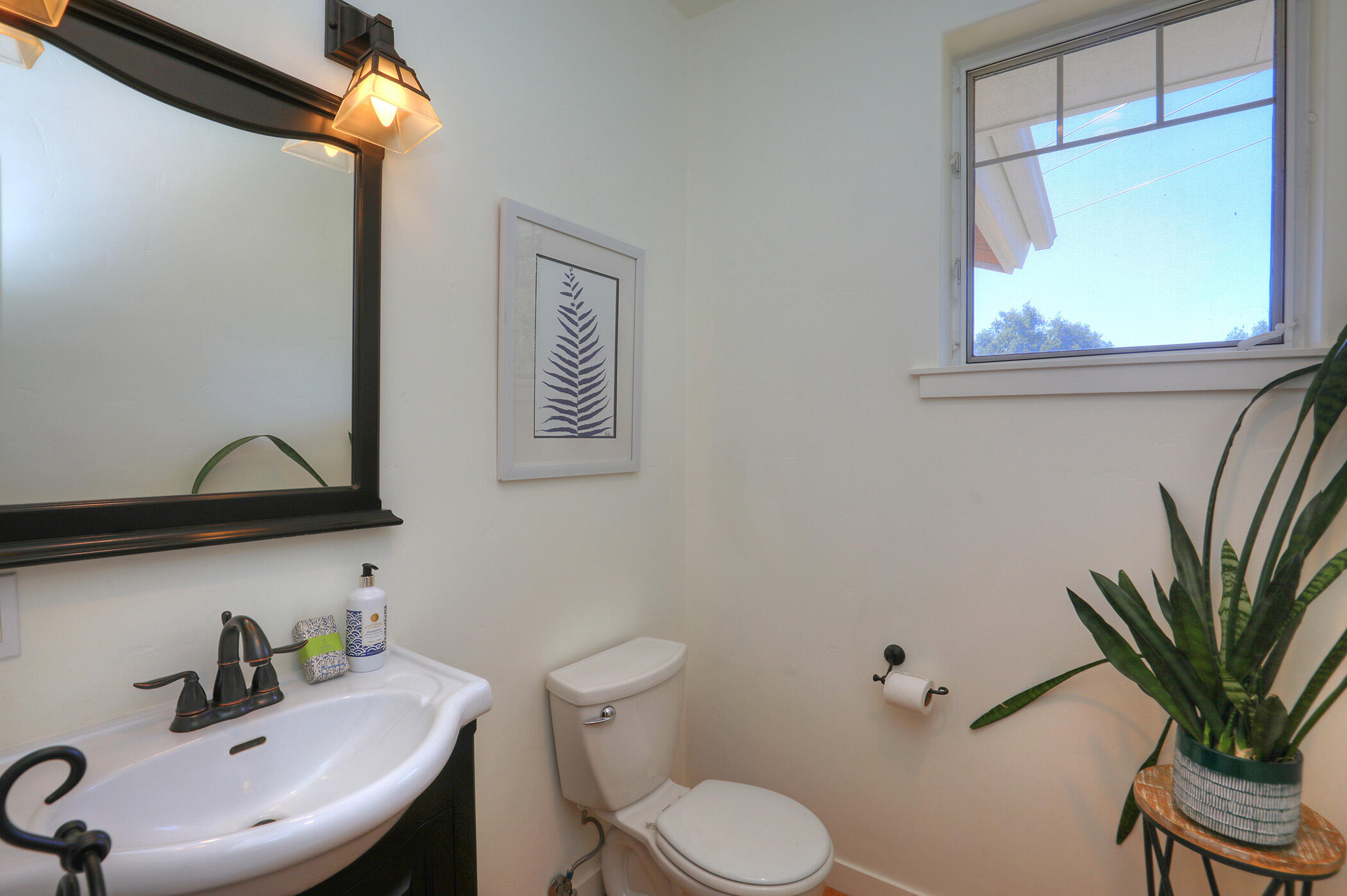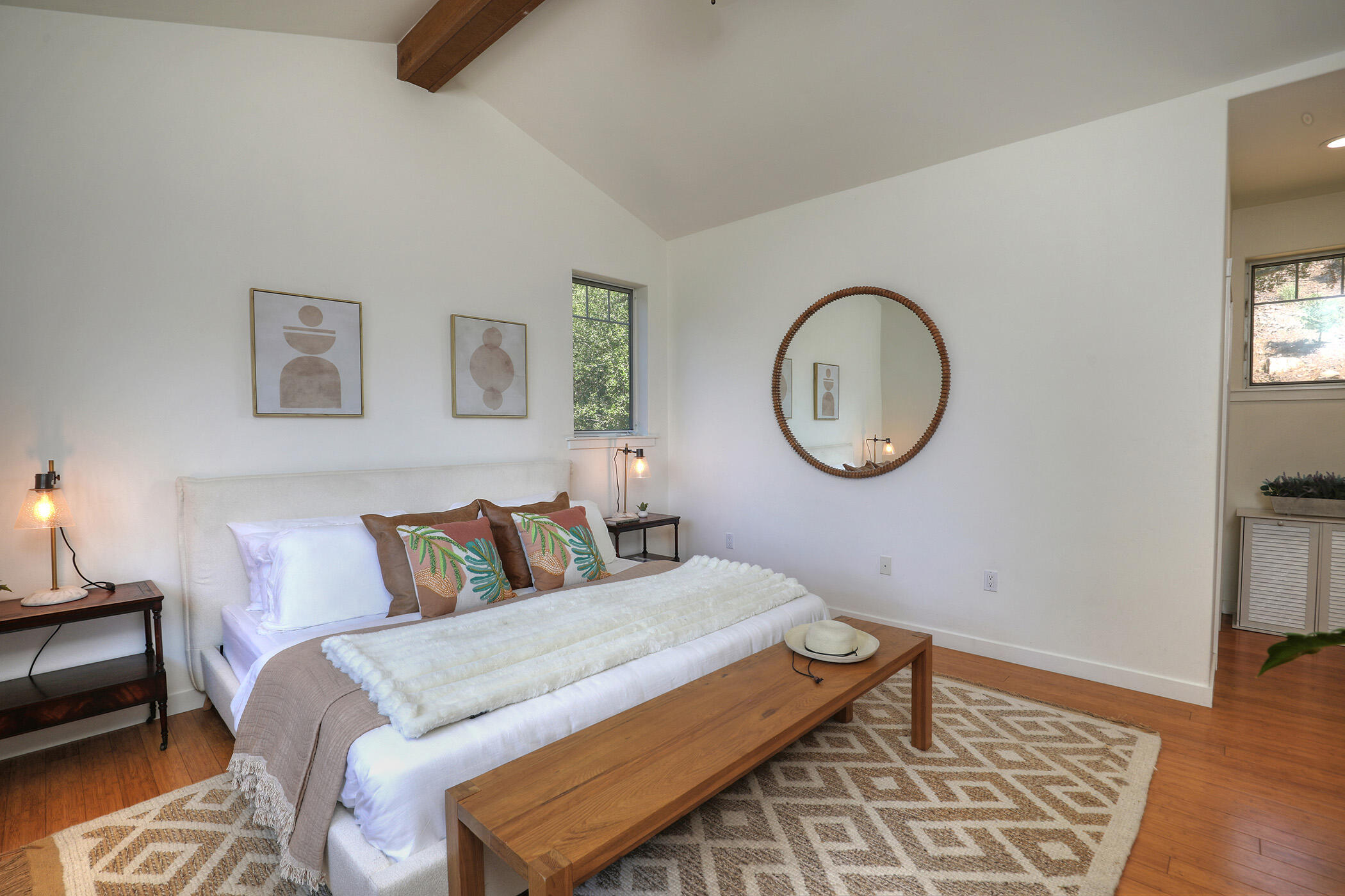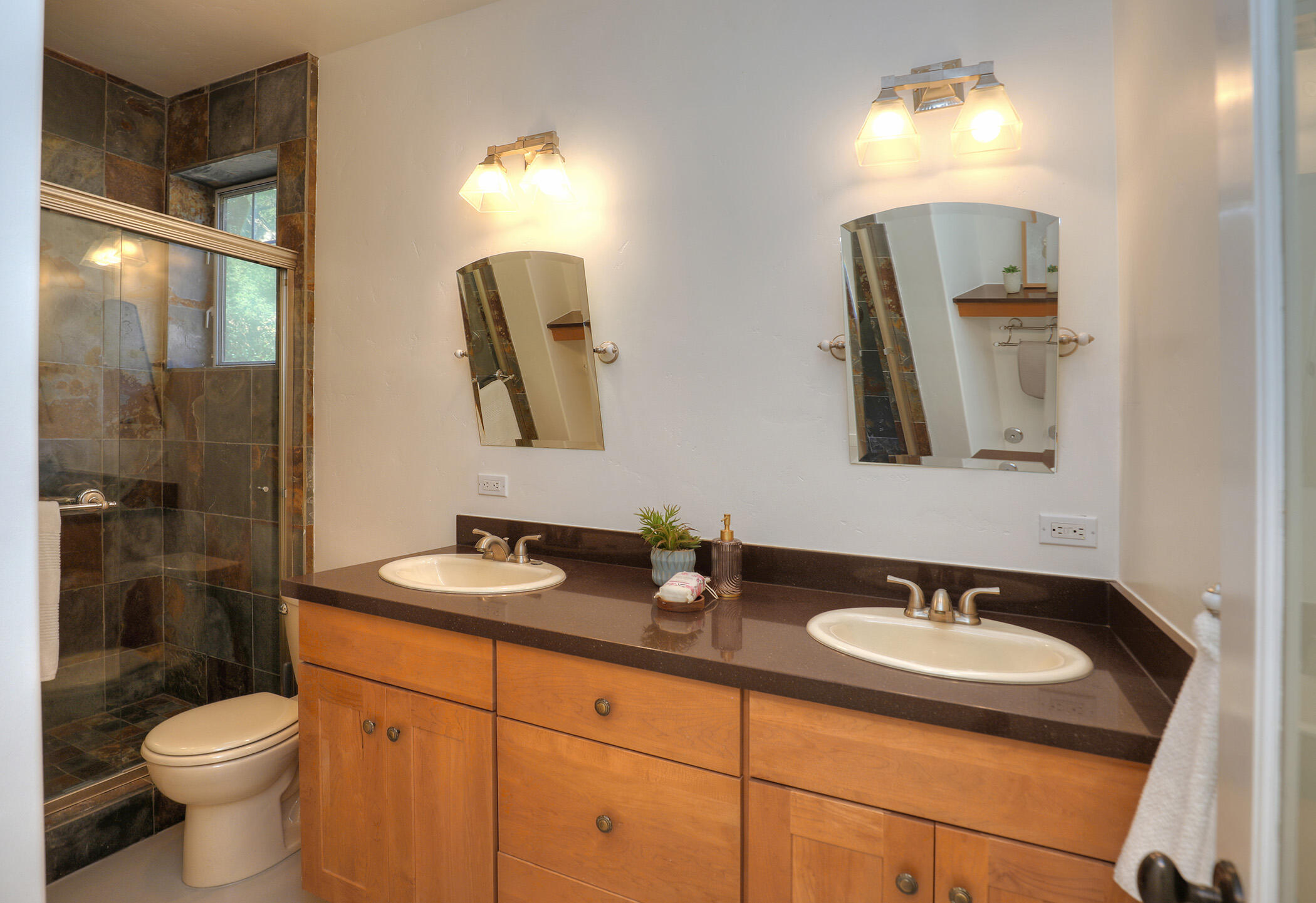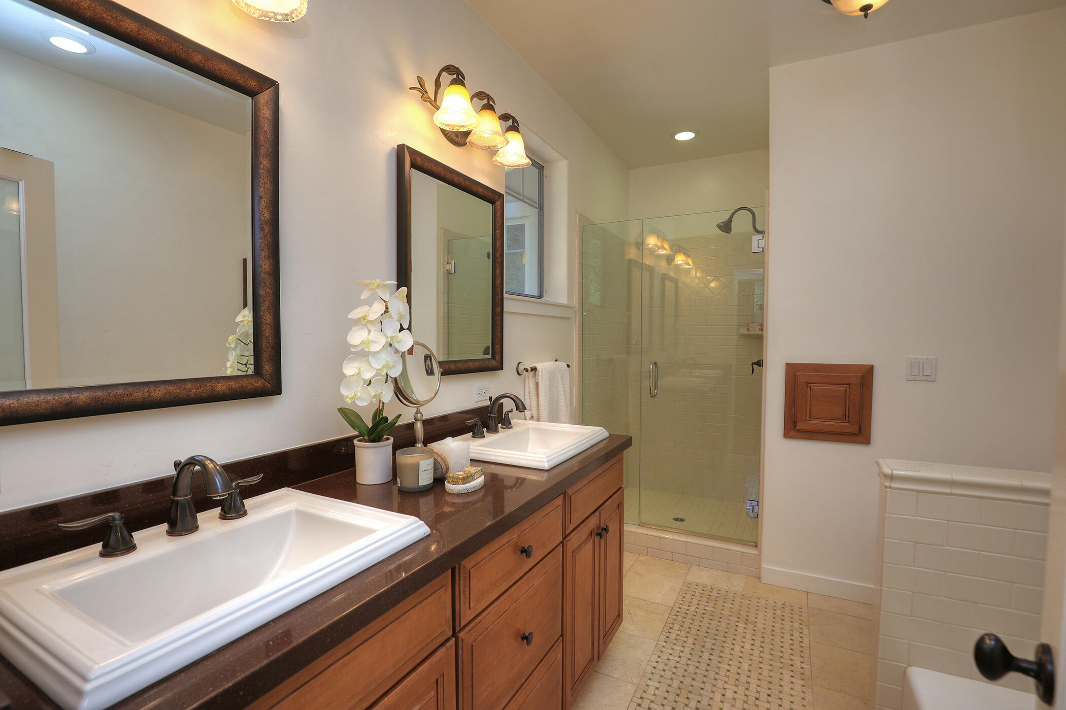 The solar powered residence offers 2,400 sq. ft. of living space with 3 bedrooms, 2.5 bathrooms, an office, laundry room, oversized two car garage, and a spacious rec room (not included in sq. ft.). The dramatic great room features 13' cathedral ceilings, a gourmet kitchen, and a river rock fireplace. Sliding glass doors open to a shaded BBQ patio on one side and a generous south facing, ocean view deck on the other perfect for entertaining and seamless indoor outdoor living.